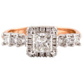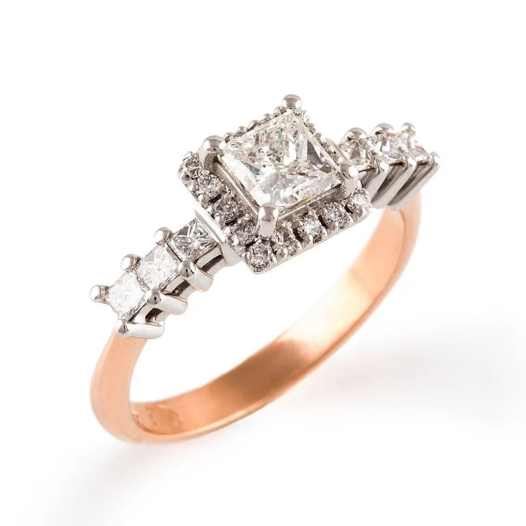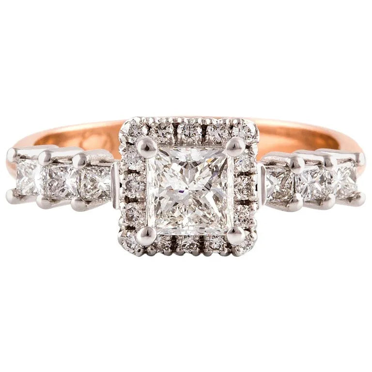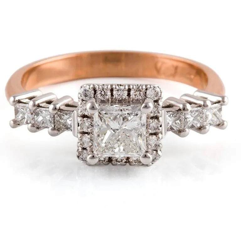 This gorgeous vintage style ring with 18ct white gold setting and rose gold band is set with a combination of princess and round brilliant cut diamonds.