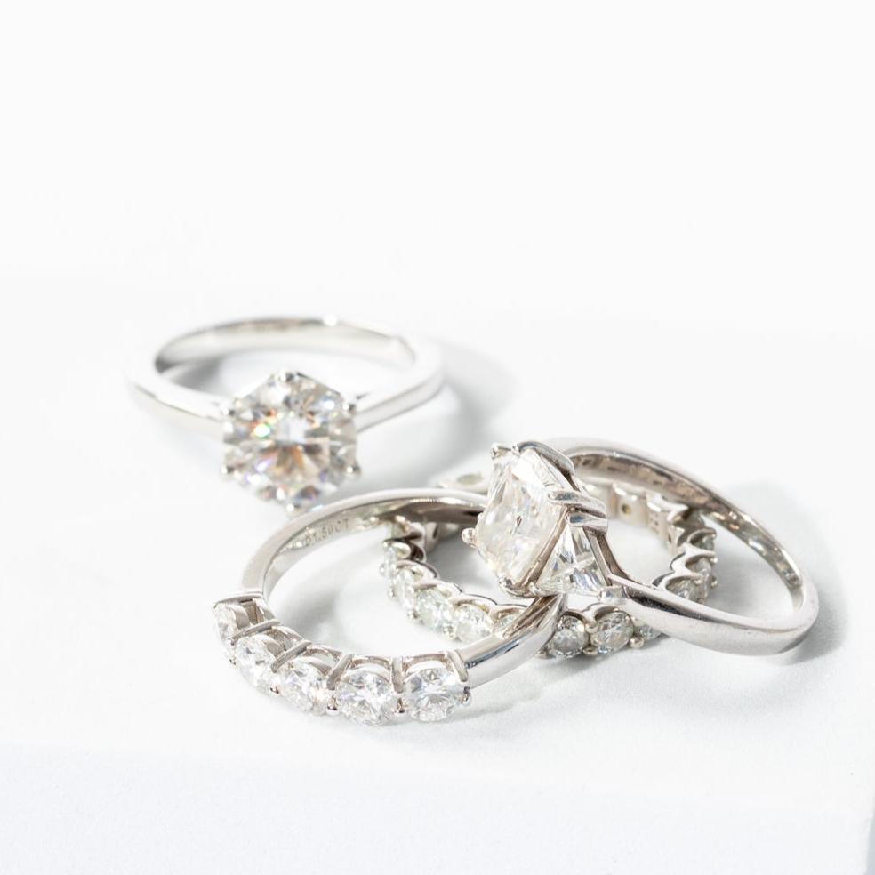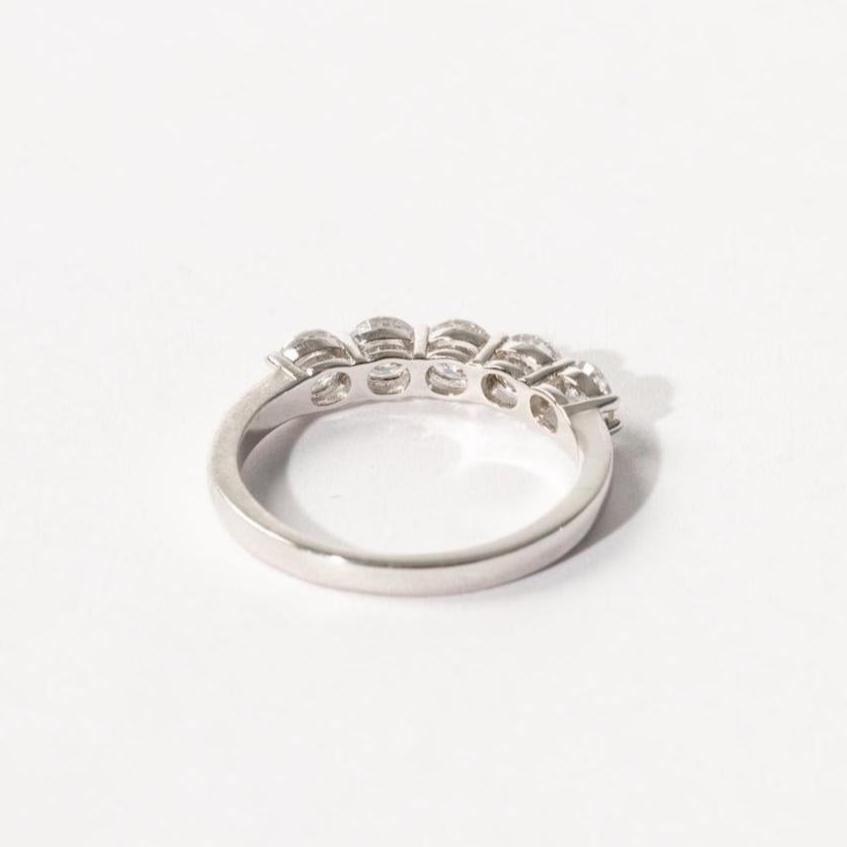 5 round brilliant cut man made moissanite diamonds. Certified best quality and highest cut and clarity. Rings in this same style with nature found diamonds and set in white gold retail for over $10,000. Ours is set in pure silver giving the same white gold colour and the same diamond sparkle and durability. Waterproof, tarnish proof. A piece for life. This ring is stunning on its own on a middle finger and divine along side any engagement ring. Such as our incredible 3 carat solitaire ring called 'Tiffany'