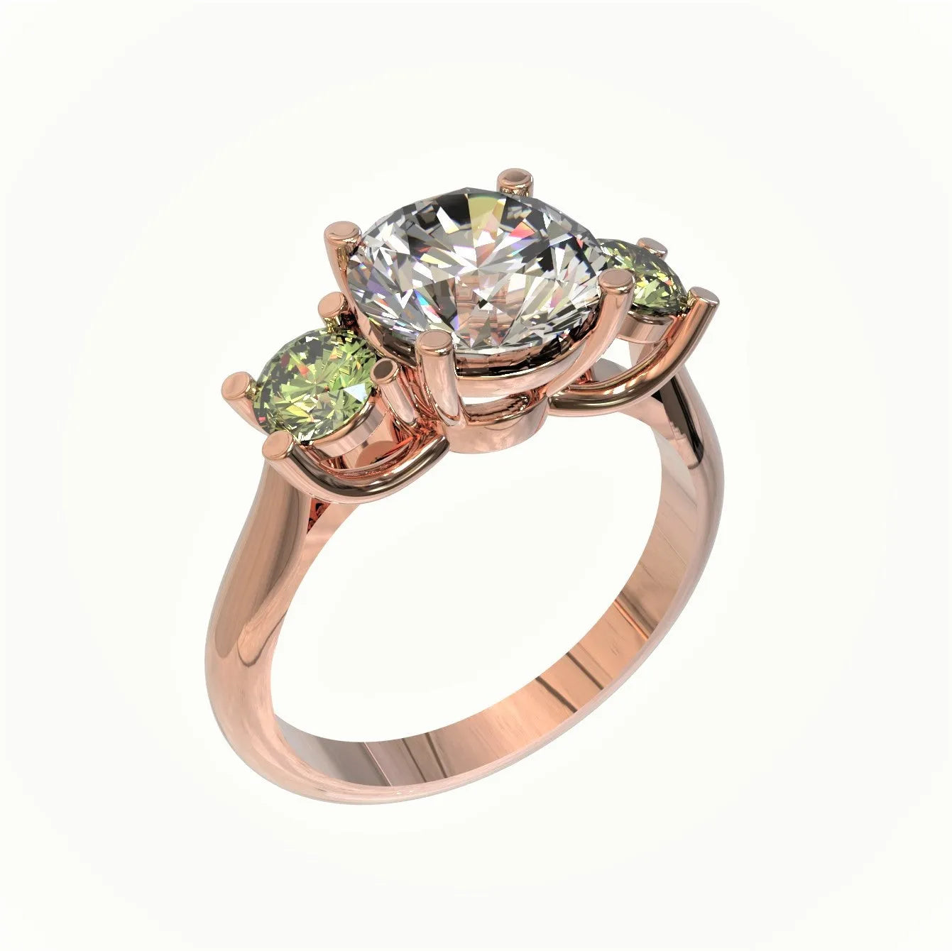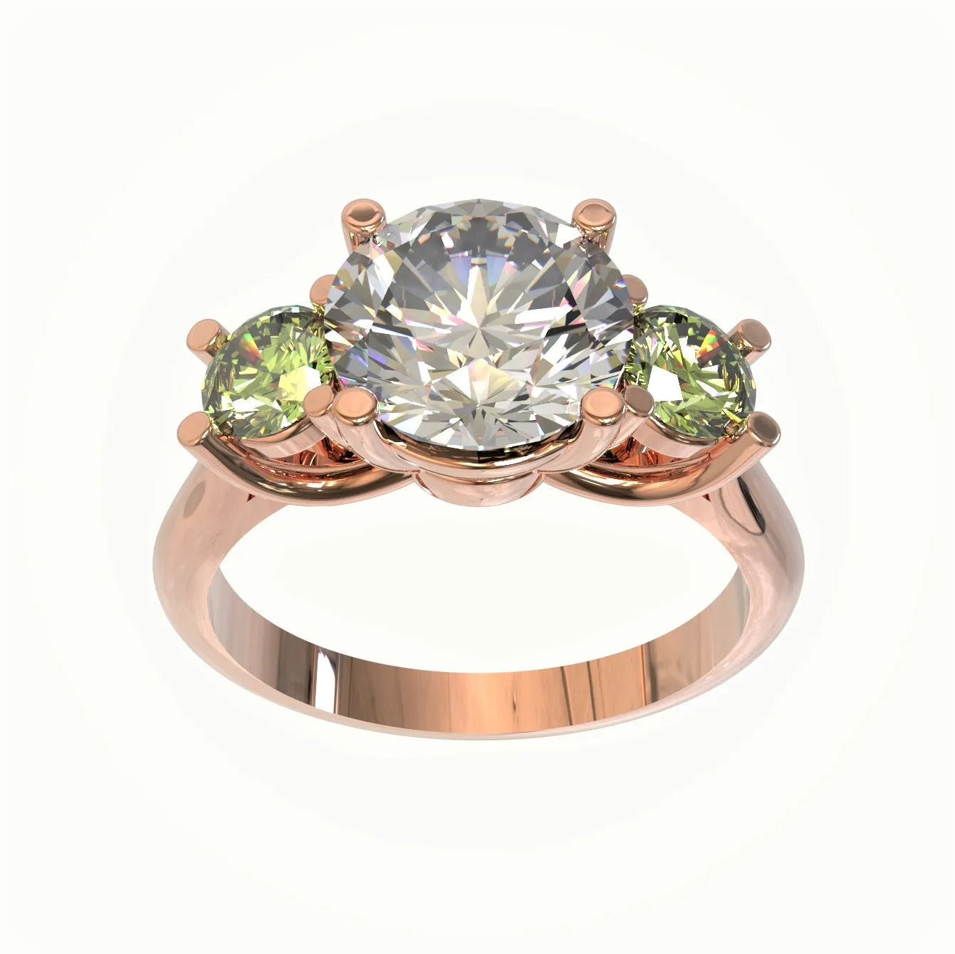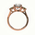 Centrally set within a round old European cut Moissanite displays a beautiful vitreous lustre. Two round green Dermantoids are similarly set on either side. Simply gorgeous.This ring made in 18 carat Rose gold.