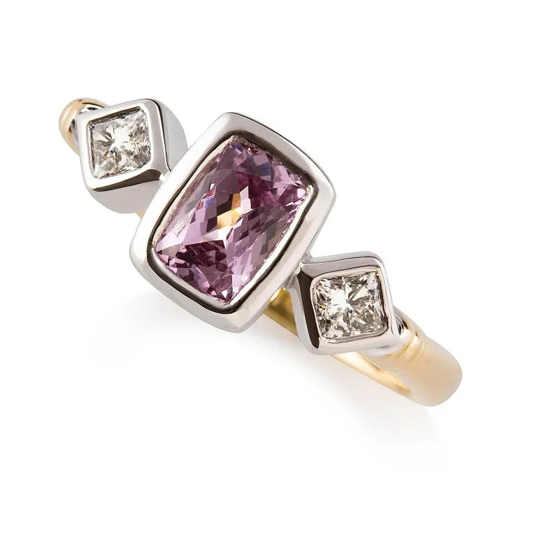 This gorgeous two-toned handmade dress ring features a stunning pink sapphire that is complimented with princess cut diamonds on either side, all set in 18ct white gold. The band is made of 18ct yellow gold with an understated shoulder detail.