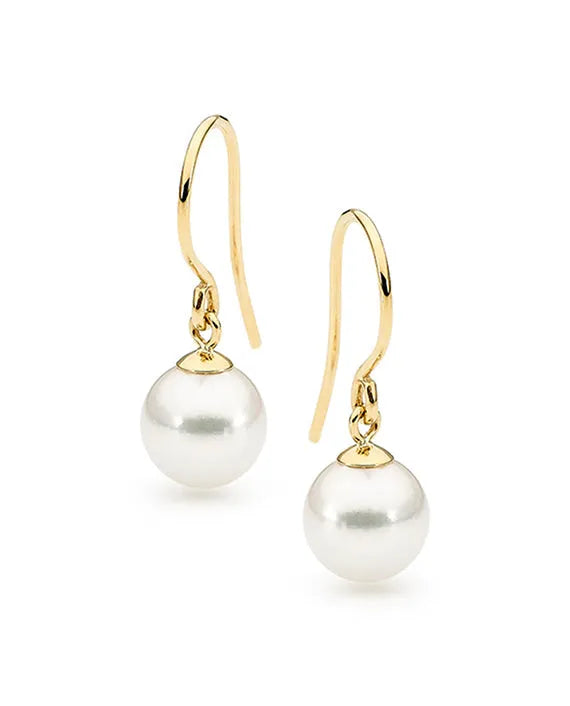 Round Freshwater Pearl White Shepherd Hook Earrings 7.5-8mm in 9 Carat Yellow Gold