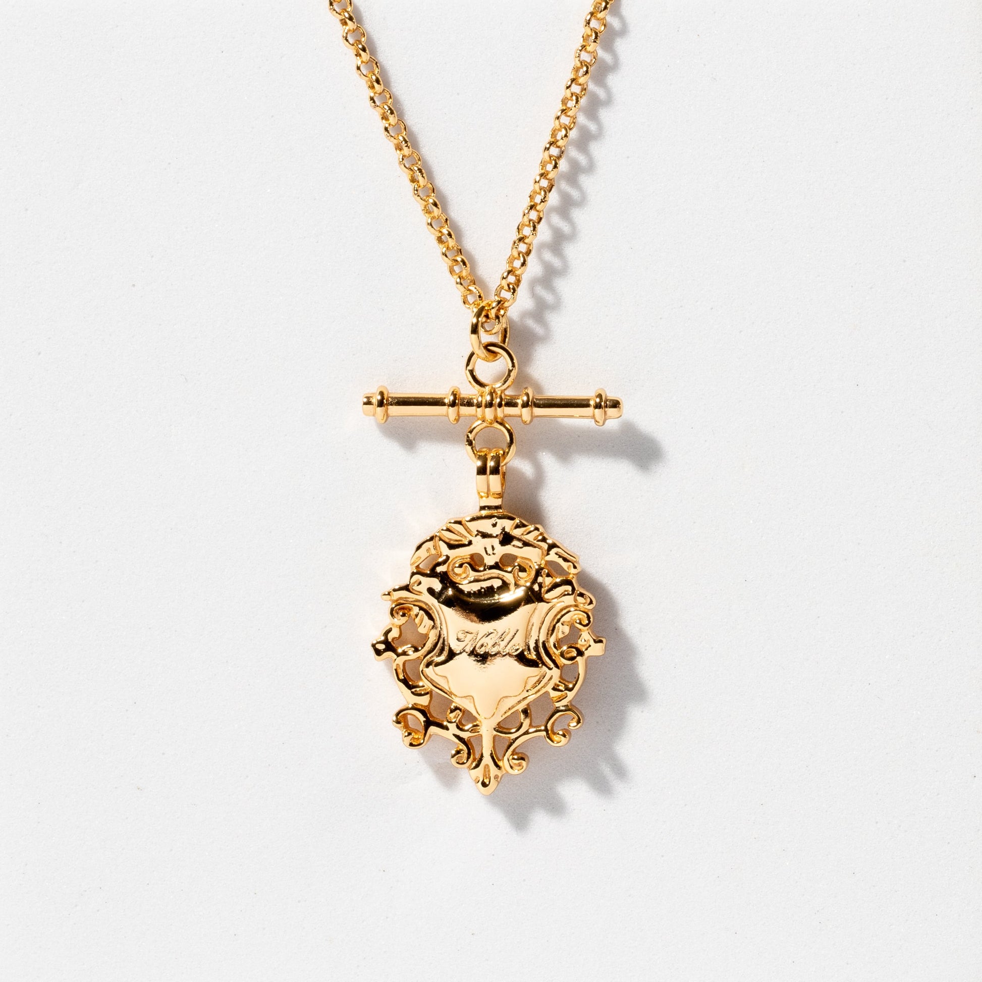 This incredible Chain with Fob bar and and Old English filigree crest with unique engravings on each side comes with a beautiful gold chain attached.
