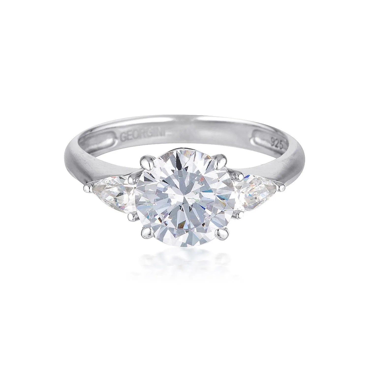 The Sabrina ring is the epitome of glamour, featuring a perfectly cut brilliant center stone, complemented by two pear-shaped stones on the shoulders. This stunning design is sure to turn heads and leave you receiving endless compliments!
