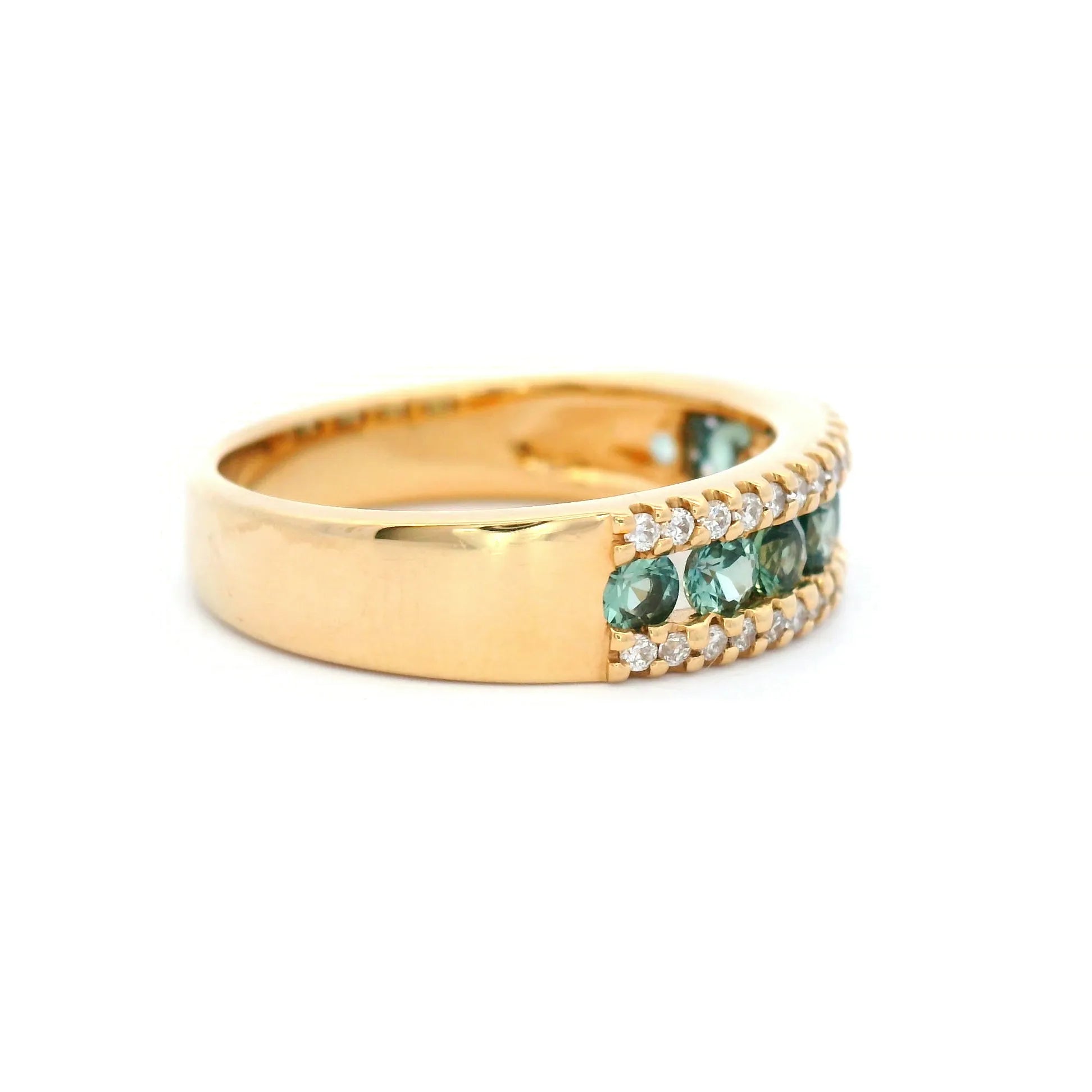 A magnificent and stunning statement piece, Mazarine features glistening round cut Teal Australian Sapphires, perfectly framed by rows of natural White Diamonds. Set on an 18ct Yellow Gold band, making it a durable and long lasting piece, perfect for a sentimental heirloom.