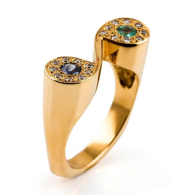 Two lovely stones, an emerald and a sapphire, are featured at the centres of the diamond settings that form this unique scroll style ring.