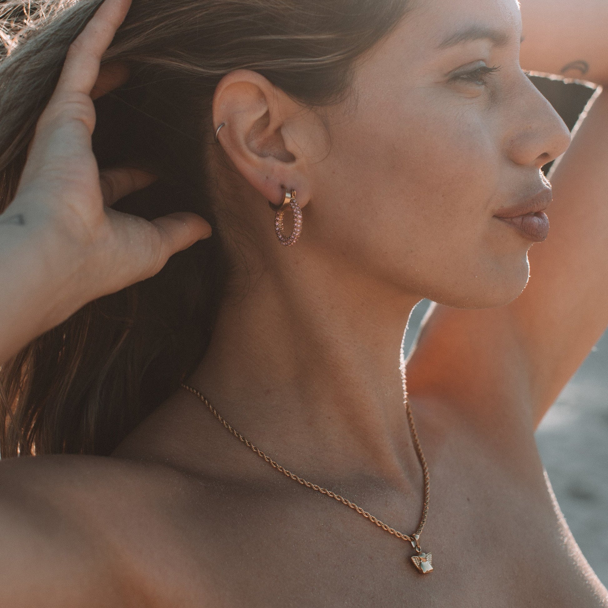Her front is a sweet hand in chin pose with wings and the back of the pendant is a different design. It is cleverly crafted to show her 'defiant' side, the back of her head and messy curls with wings framing. A unique gift for yourself or someone special.Â