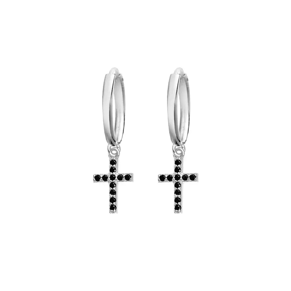 These sterling silver huggie earrings feature a striking black cubic zirconia (BCZ) cross drop, combining contemporary style with spiritual symbolism. Each earring measures 20 x 6 mm, perfect for adding a subtle yet distinctive touch to any outfit. Available in sterling silver, they are ideal for those who prefer a monochromatic and modern aesthetic in their accessories.