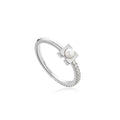Embrace modern pearls and sparkle to create an elevated ring stack this season. Featuring a pearl centrepiece and a row of shimmering cubic zirconia stones, this stylish band ring is crafted in rhodium-plated sterling silver. Style yours with simple silver stacking rings or pair next to a statement signet ring for a bold look.