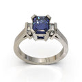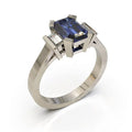 Art Deco style, this elegant ring is made in platinum and set with a stunning Ceylon sapphire with a pair of baguette diamonds on either side.