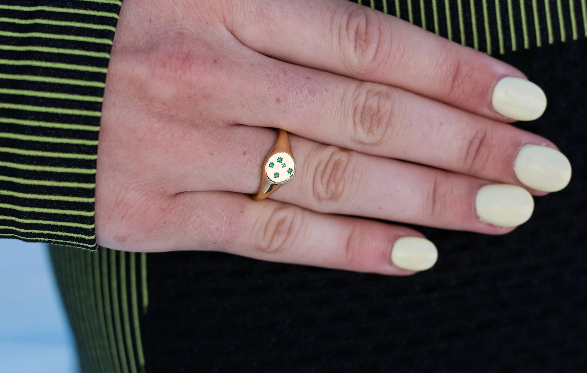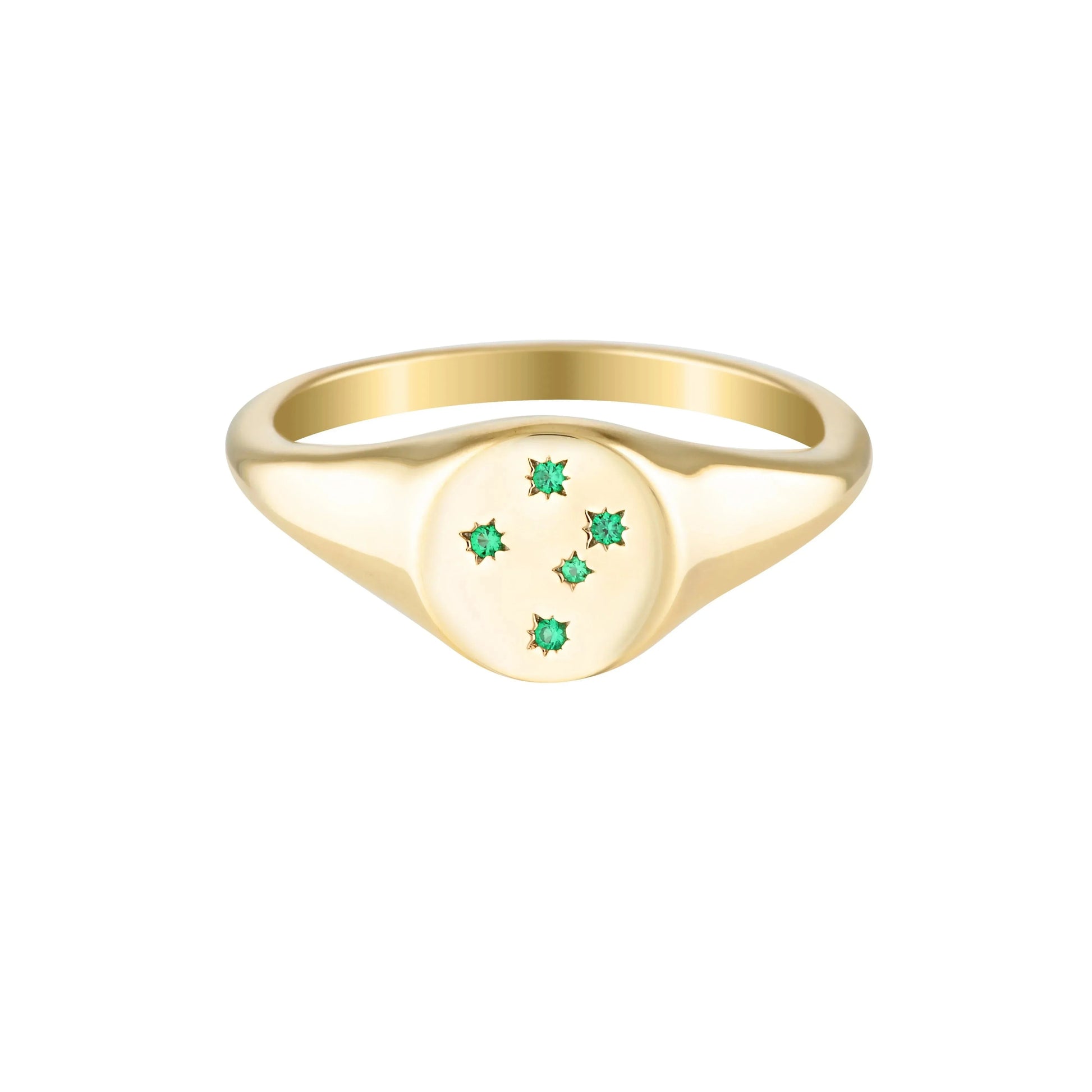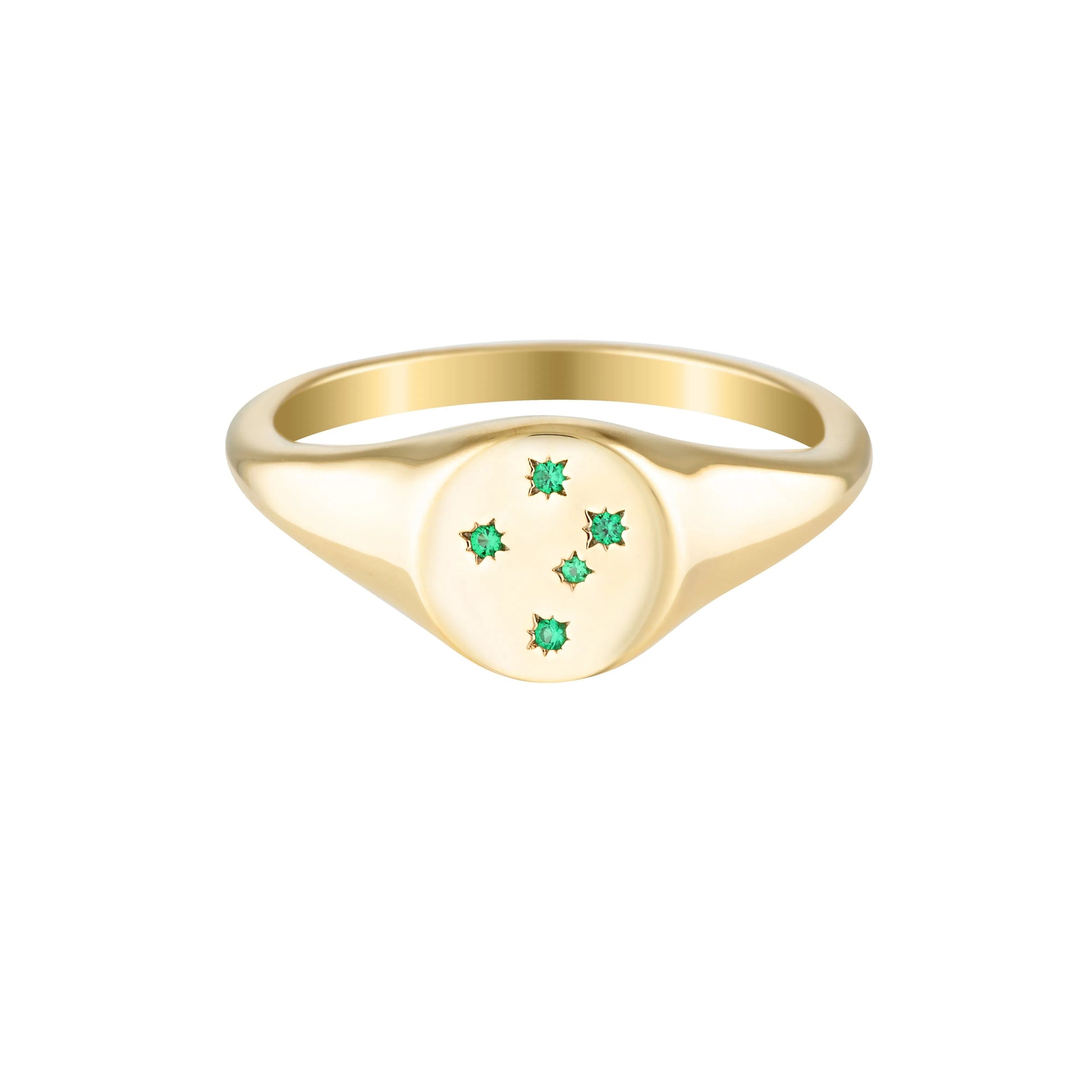 The Southern Cross is one of Australia's oldest and most revered symbols, rooted in Indigenous cosmology and embraced as a sign of independence, resistance, and loyalty. This elegant ring honours that heritage with a vibrant emerald green nano stone set in the form of the Southern Cross. Crafted in 18ct Gold Plated 925 Sterling Silver, it offers both cultural significance and refined beauty.
