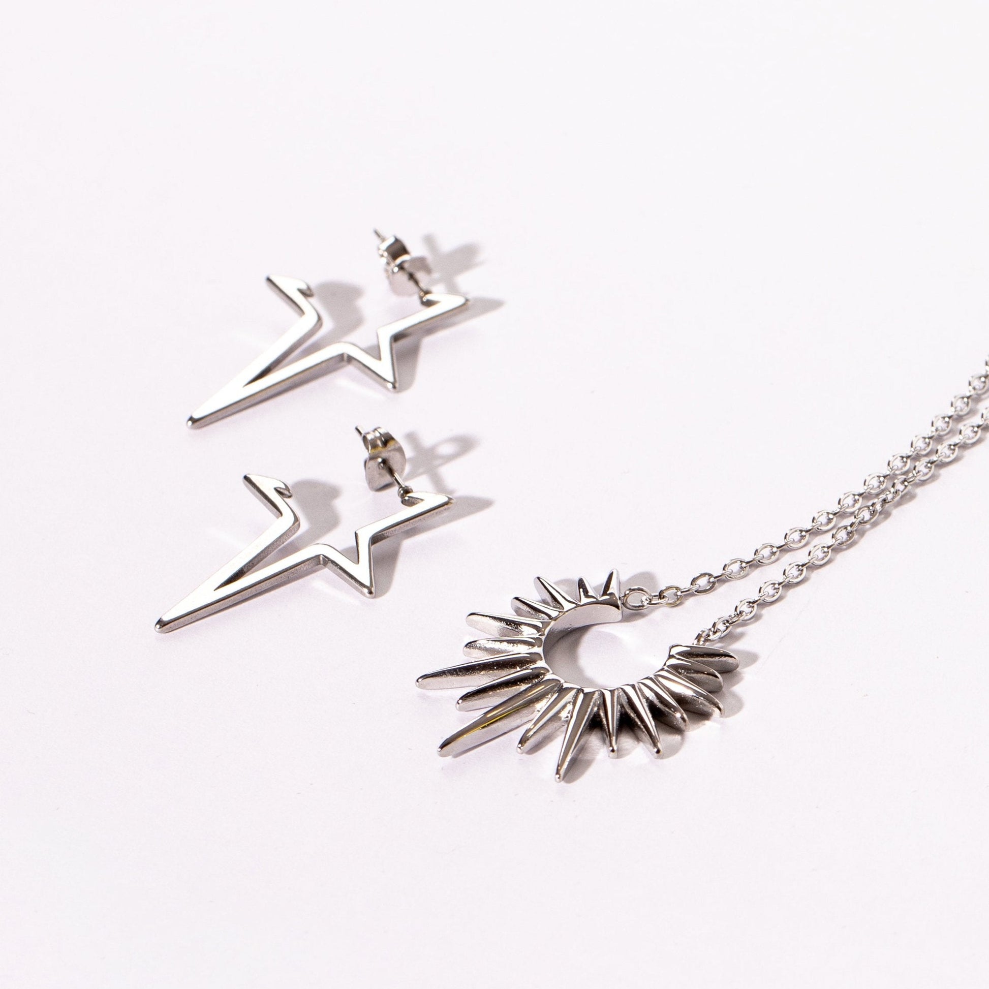 A unique statement necklace highlighting a North Star, beautifully surrounded by eight shining bursts on each side.