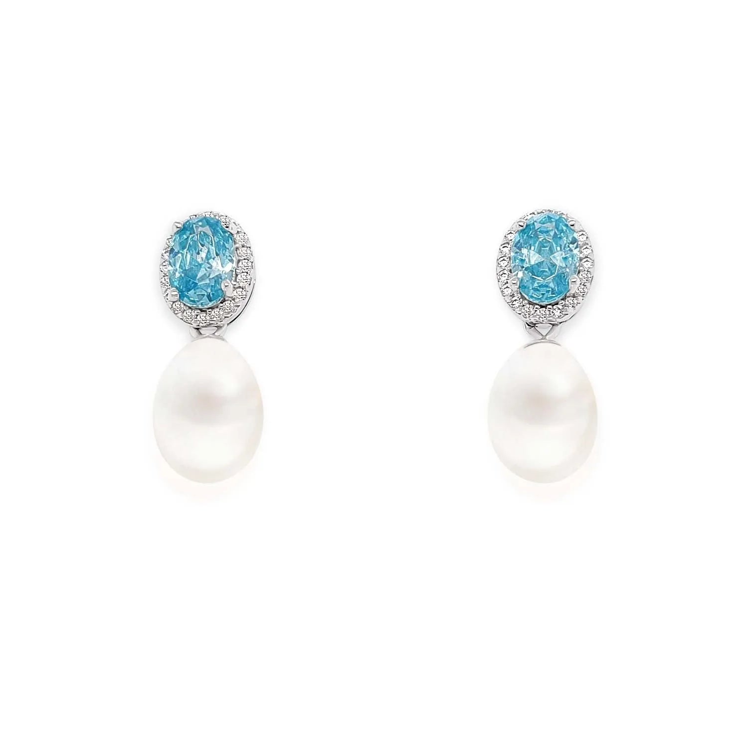 Sterling Silver Oval Facted Aqua Cubic Zirconia With Halo Setting & Freshwater Pearl Drop Earrings