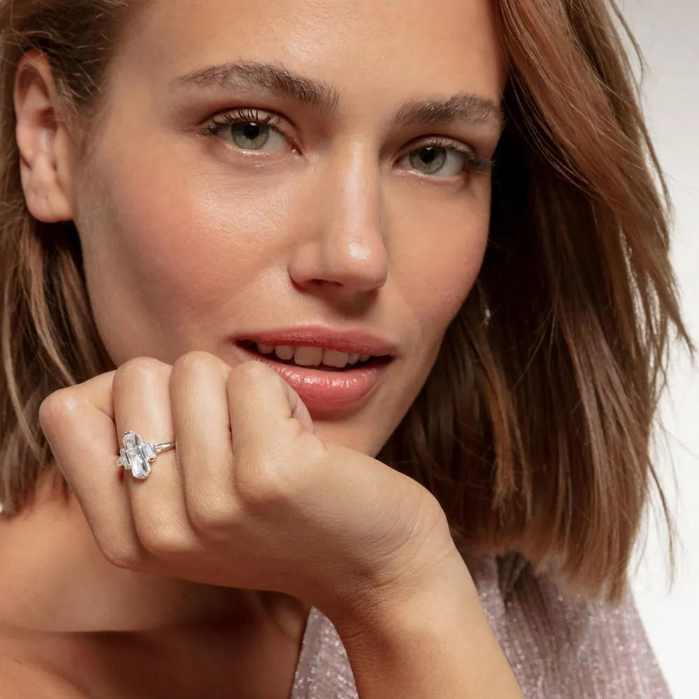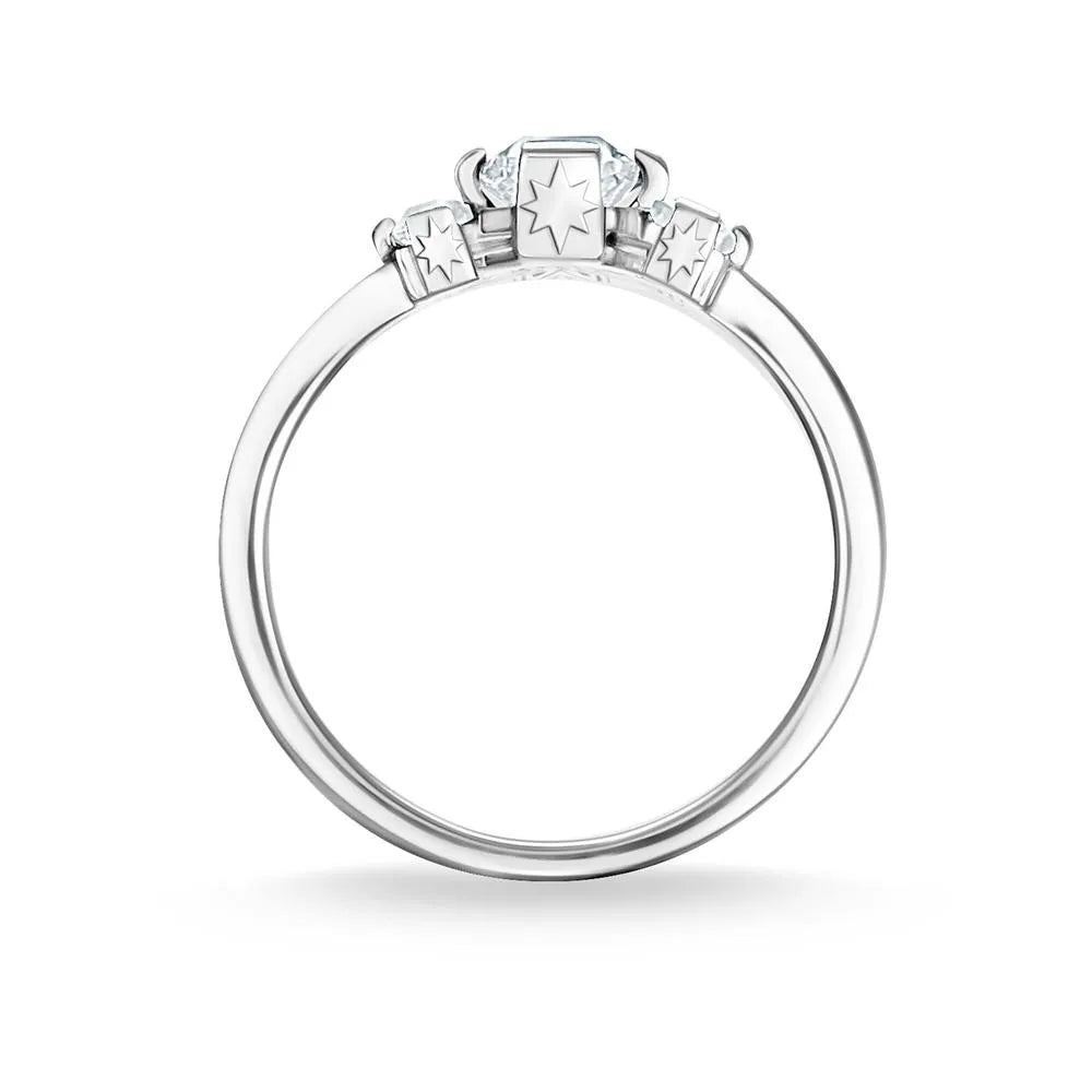 The highlight of this magical ring is the bright white zirconia stone in baguette shape, which sparkles in the light and is faceted by hand in a octagon cut. The centre stone is framed by two other small stones in a baguette cut. Small, lateral star details enchant in detail with their magical sparkle.