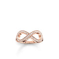 The midi ring with 18ct rose gold plating is an homage to the popular THOMAS SABO infinity ring. With dazzling pavé zirconia, the filigree eternity symbol envelops the fingertips, creating a particularly youthful and personal look.