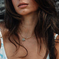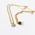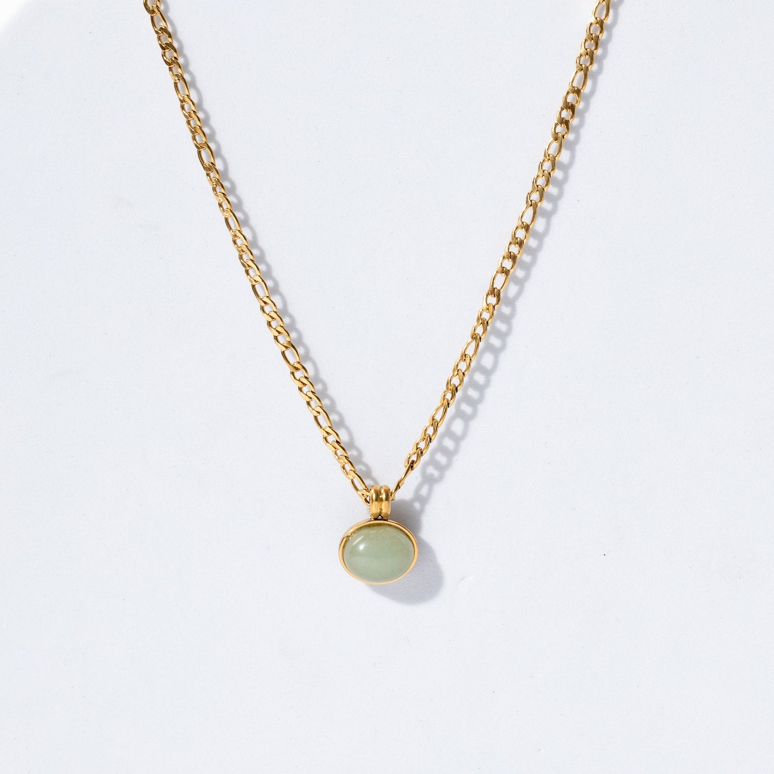 A gorgeous eye shaped pale jade coloured gem set in gold on a stylish open link chain. Available in Dark Green, Light Green and Aqua.Â