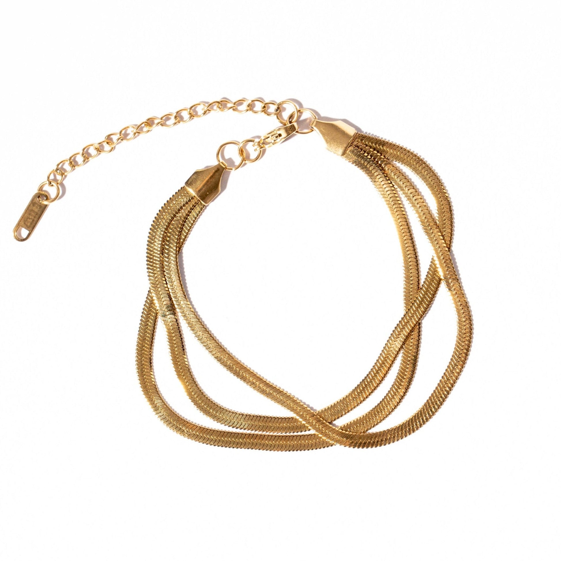 Classic, simplistic glamour with a twist! An everyday piece, everyone loves. The three strands move gently as you do, creating sheen and glistening gold on your wrists. Don't forget to check out our matching necklaces.