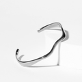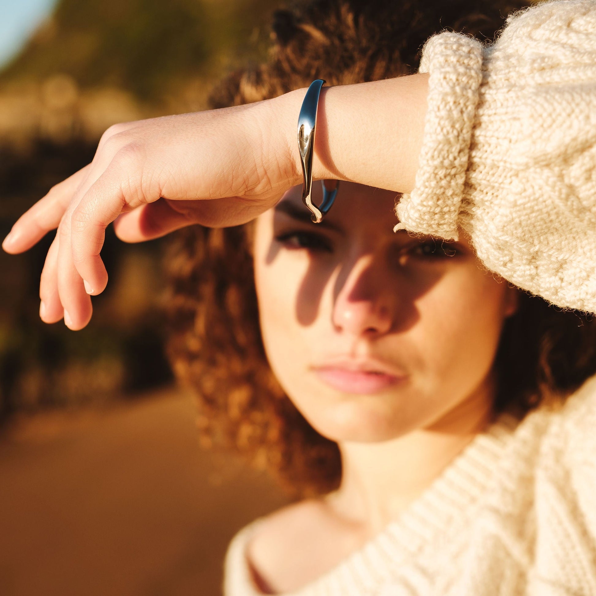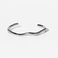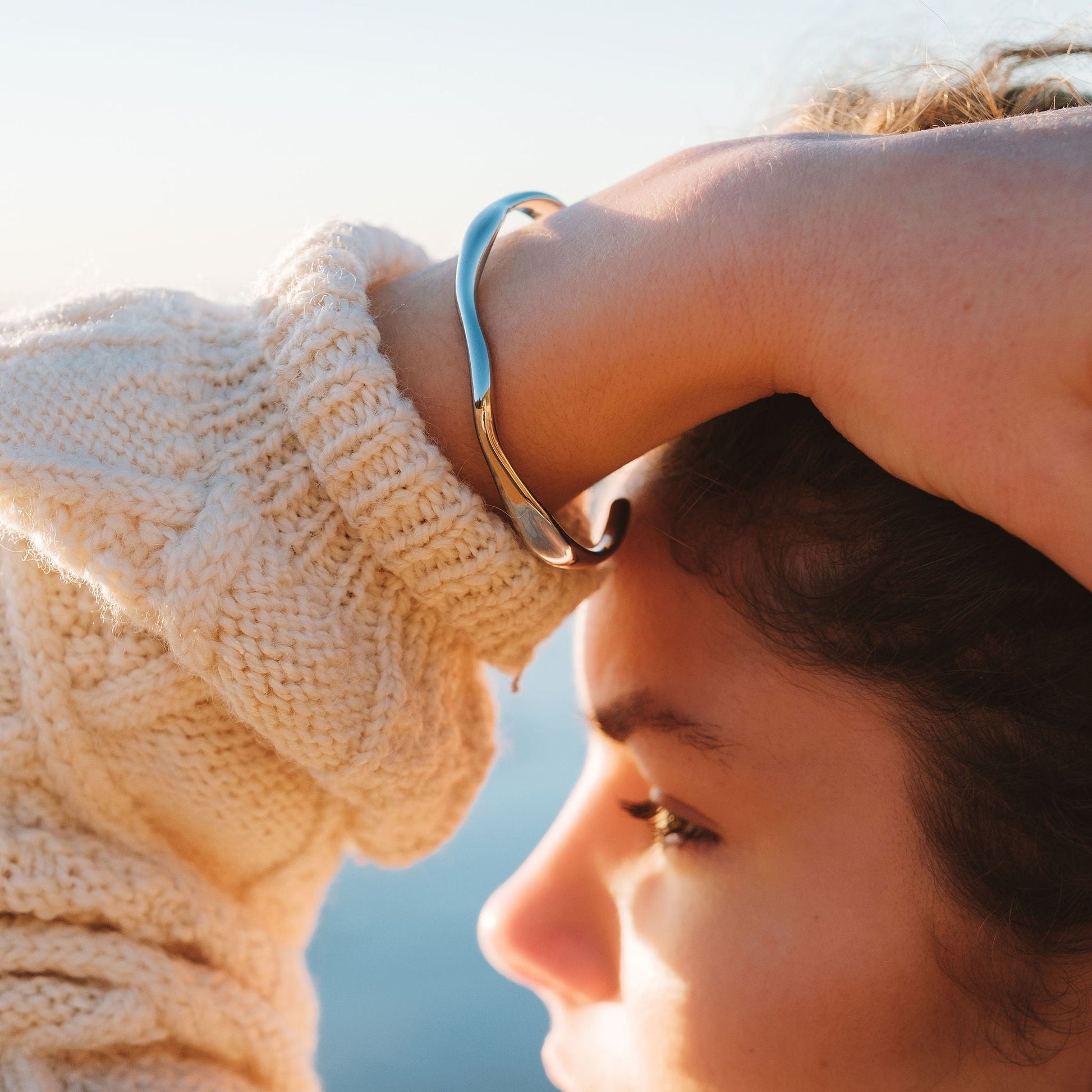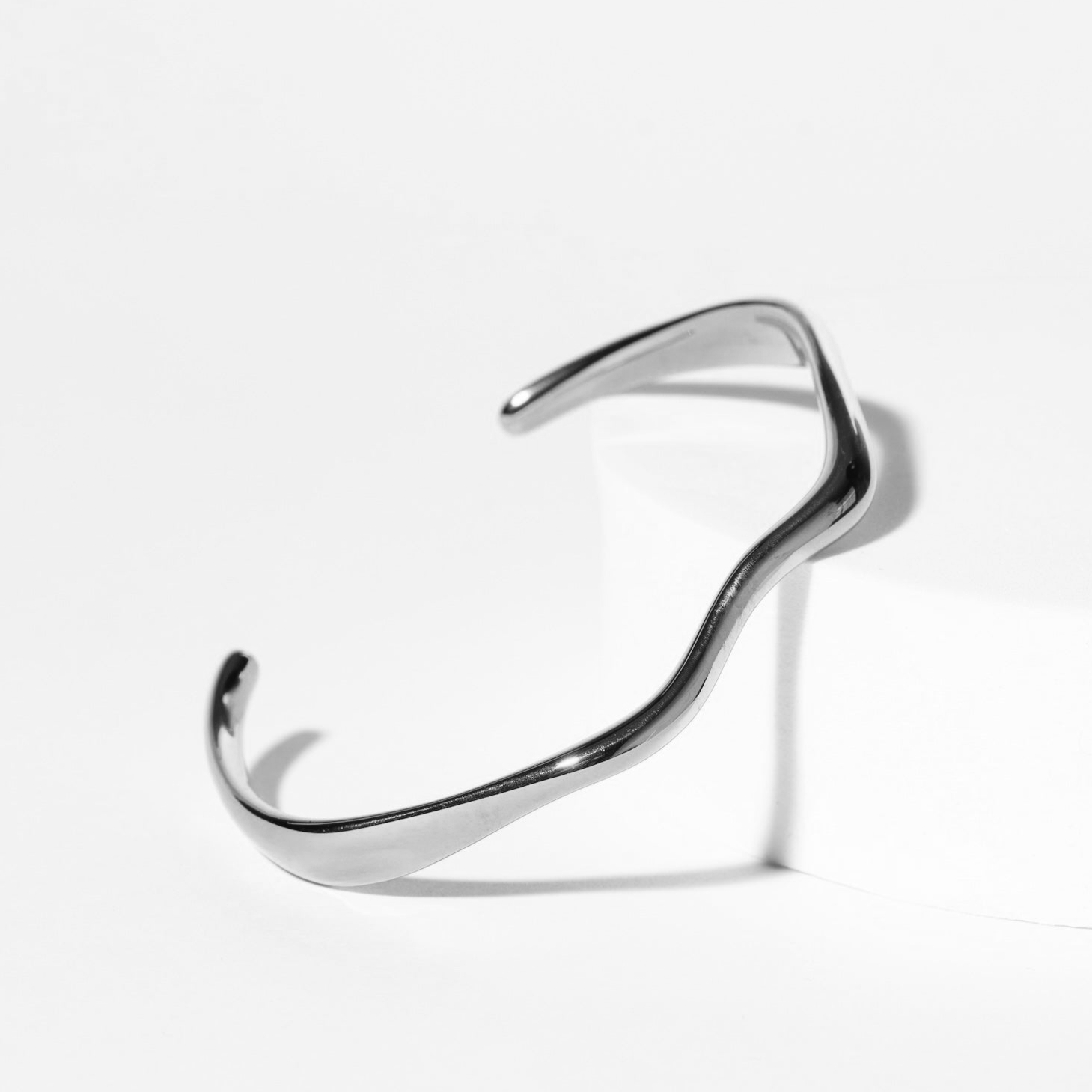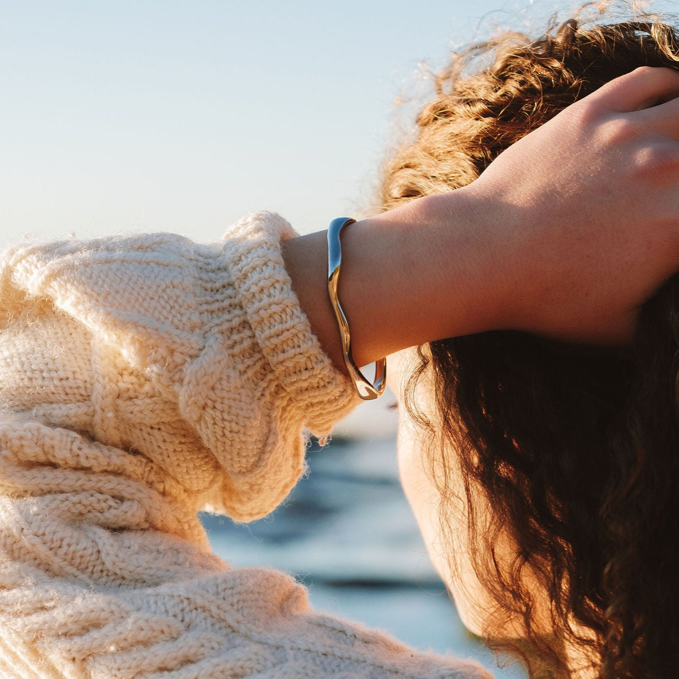 Our wave at it's widest is 5mm and at it's lowest tide is 3mm. Silver that is permanently bonded to the stainless steel base means this baby is as good as solid silver. Our wave cuff can be lovingly bended without the worry of it breaking to fit the smallest or the widest part of any arm. Sturdy, durable, won't fall off and goes with everything!