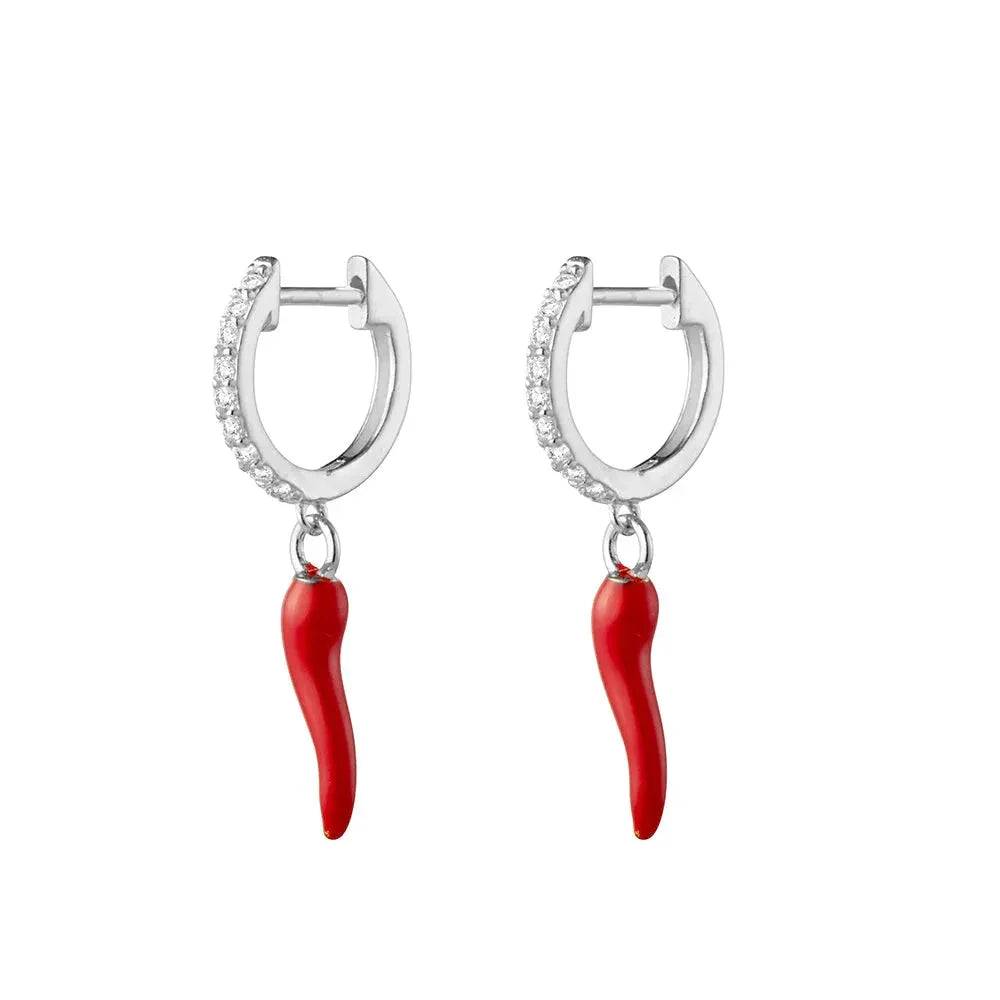 Sterling Silver Cz Huggie Earrings With Red “Cornicello” Horn Charm