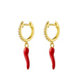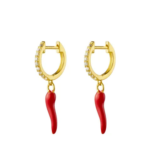 Yellow Gold Plated CZ Huggie Earrings With Red “Cornicello” Horn Charm