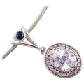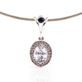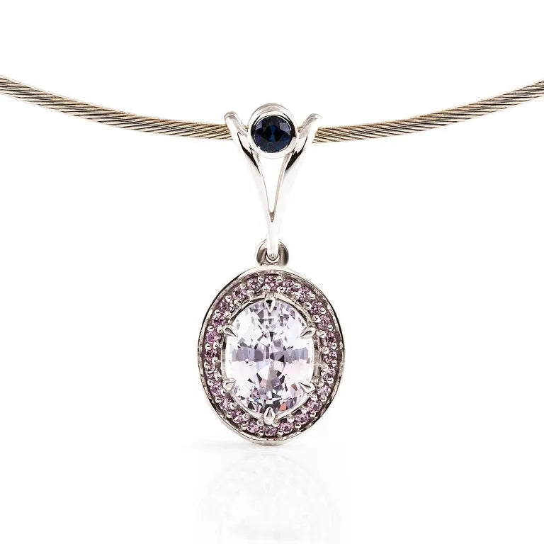 This unique pendant is set with a stunning rare light pink Ceylon sapphire which is surrounded by a halo of slightly darker pink sapphires. The fancy split bail is set with white and blue sapphires and threaded upon a cable chain.