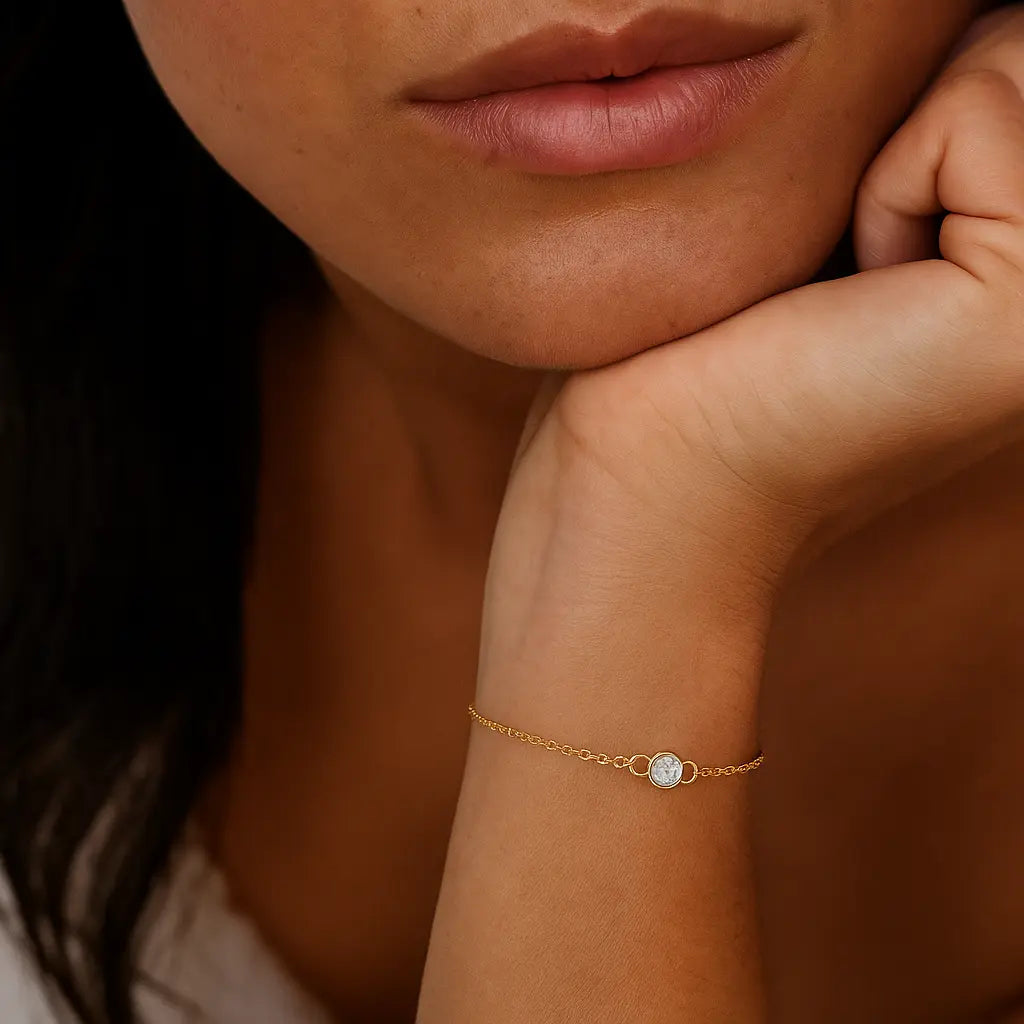 This elegant bracelet features a sparkling 5mm zircon stone set in a sleek 925 sterling silver or gold-plated frame. The design is both delicate and timeless, offering a stunning look for any occasion. The bracelet measures 16.5cm, with an additional 2cm extension for a more customizable fit. Perfect for adding a touch of luxury to your wrist, it’s ideal for layering or wearing alone for an understated yet elegant look.