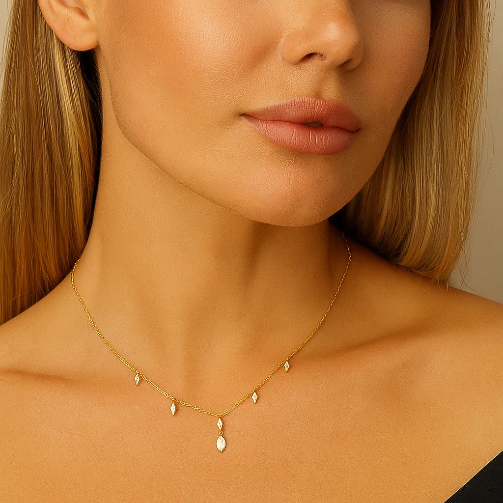 This stunning necklace features AAAA zircon stones, set in high-quality 925 sterling silver. The delicate chain is adorned with several sparkling stones, including a central teardrop design, making it the perfect choice for both elegant and casual wear. The adjustable chain length of 40+5 cm ensures a comfortable fit, while the intricate design adds a luxurious touch to any outfit. The necklace weighs just 1.85g, making it lightweight and comfortable to wear all day long.